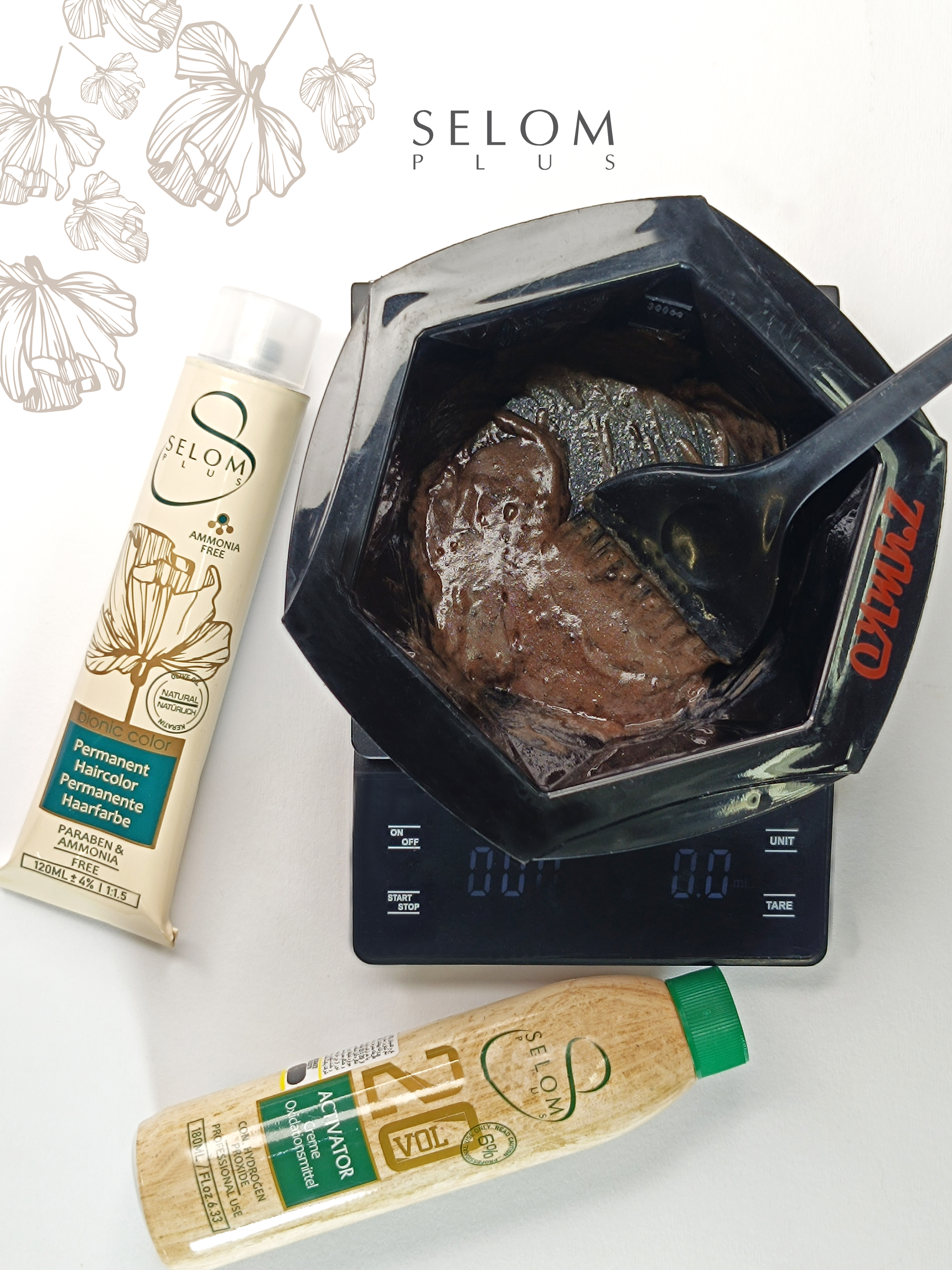 - رنگ موی سلوم پلاس را با اکسیدان های 3، 6، 9یا 12درصد به نسبت 1 به 5/1 (برای مثال: 50 میل رنگ مو + 75 میل اکسیدان) با توجه به نتیجه مورد نظر خود مخلوط کنید.